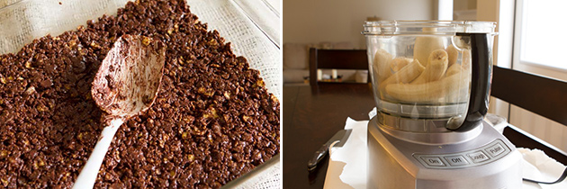 Transfer banana soft serve to a tupperware container and store in the freezer while you cut the chocolate into twelve, 3″x3″ squares.