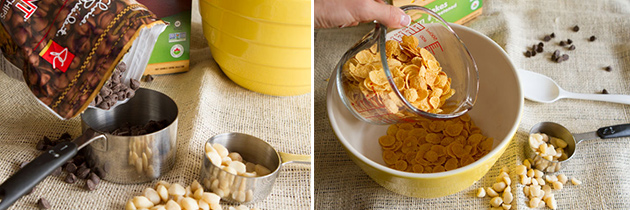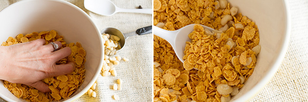 Add cereal to a bowl and crush with hands until broken down. You can also use a potato masher.