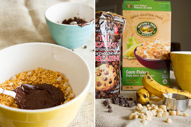 Add crushed macadamia nuts (if using) and melted chocolate. Stir until everything is coated.