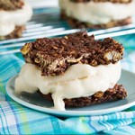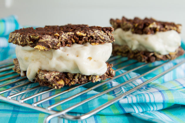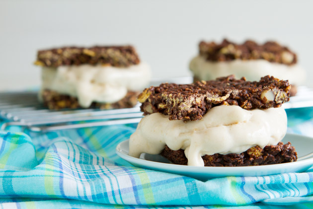 Take two squares and spread the banana soft serve between the two to make sandwiches. Place on a parchment paper lined plate or, if you’re planning to keep them in the freezer for awhile until serving, wrap each individually in foil, parchment paper or freezer wrap. Freeze until about firm, about 30 minutes.