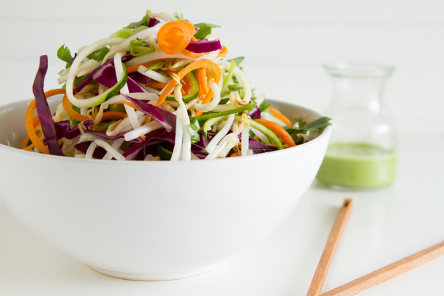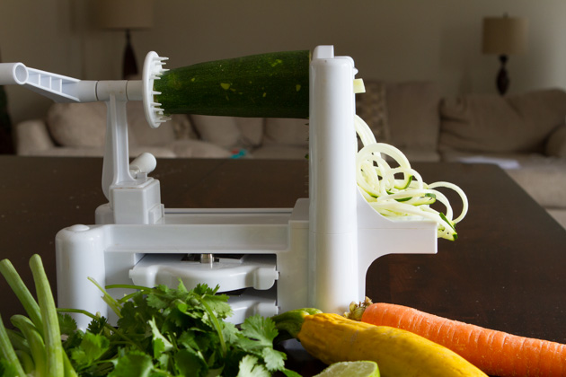 If you do not have a spiralizer, you can either use a cheese grater to prepare the zucchini and carrot or, use a vegetable peeler and just continue to peel the vegetable, using the long ribbons for the salad.