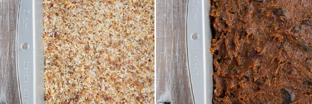 Once the crust is complete, firmly press it into your prepared pan. There’s quite a bit of natural oils so you shouldn’t have to worry about the dessert sticking to the pan. If you’re concerned with this, feel free to drape parchment paper over the sides of the pan.