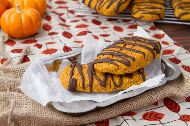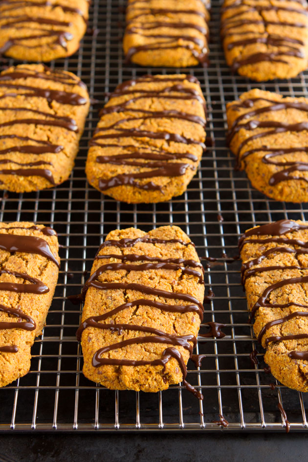 Moist grain-free (and paleo!) protein bars made with pumpkin puree, protein powder and magnesium, drizzled with a healthy layer of melted chocolate.