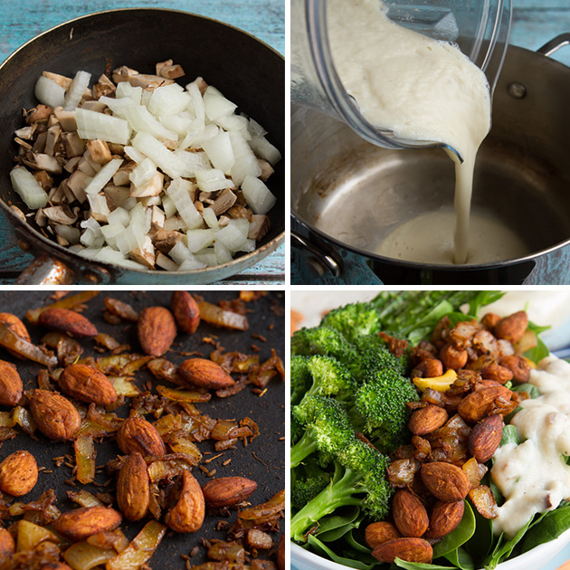 2. Meanwhile, add oil and cumin seeds to a medium-sized frying pan. Toast on medium-high heat for 2 minutes, until fragrant. Add onions and garlic. Reduce heat to medium-low and saute for 10 minutes, adding a splash of water a couple of times if needed. Add almonds, paprika and salt. Continue to saute for 10 minutes.