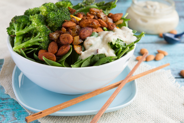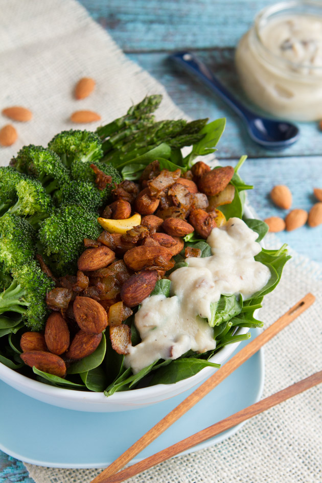 Greens bowl loaded with steamed greens, paprika roasted almonds and a creamy mushroom sauce.