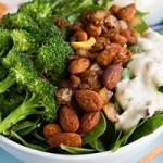 3. Place 2 cups of spinach in the bottom of each bowl. Pour mushroom soup over top then stack veggies and paprika almonds on top. Serve!