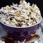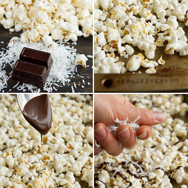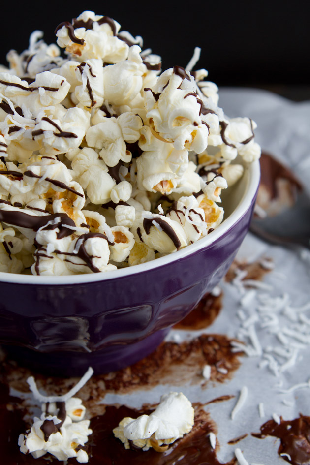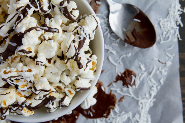 Chocolate-drenched popcorn with a sprinkle of shredded coconut and sea salt. The ultimate recipe to soothe chocolate cravings – under 300 calories for the entire batch!