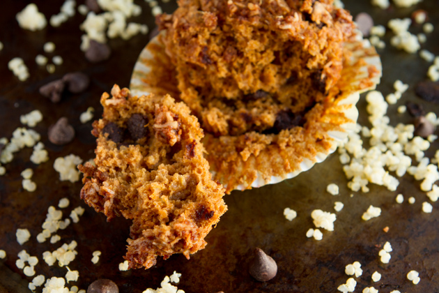 Gluten-free muffins made with roasted sweet potato and chocolate chunks. Topped with a maple-infused quinoa crumble topping.