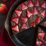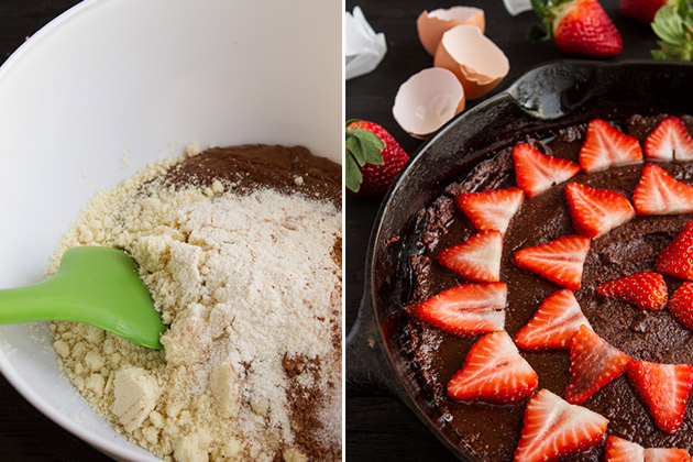 Paleo chocolate cake baked in a skillet for a no-fuss approach to dessert. Sweetened with figs and topped with thinly sliced strawberries.