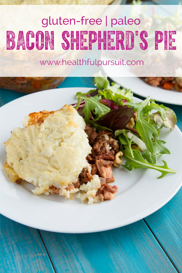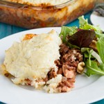 Shepherd’s pie (also known as cottage pie) layered with sauteed beef, bacon and veggies in a smoked sauce, topped with garlic mashed cauliflower and baked until crisp.