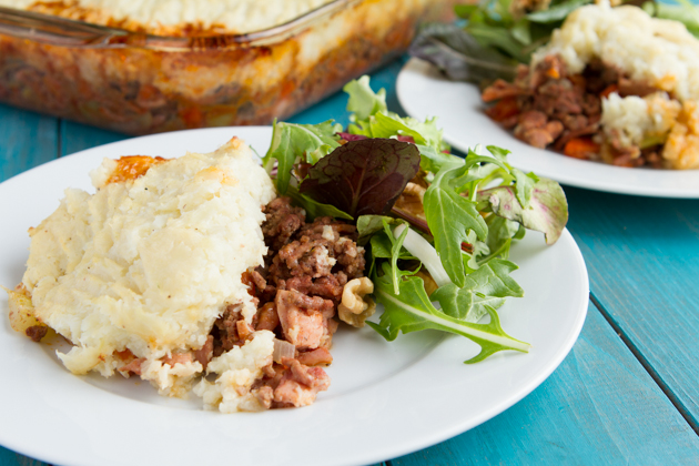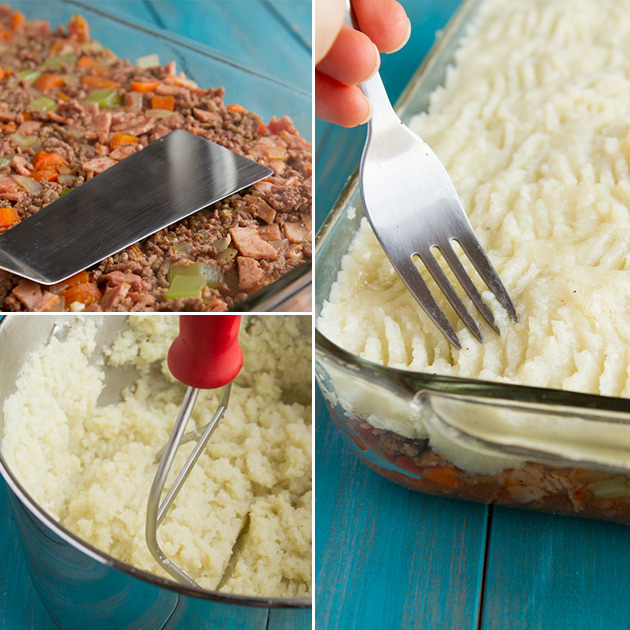 Smoothing and packing down the meat is the key to this recipe. So is mashing the cauliflower until very smooth (especially if you want to trick people in thinking it’s potato!)