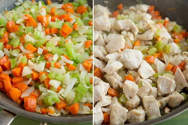 2. Add the coconut oil, garlic, onions, celery and carrots to a large frying pan. Saute on medium heat while you cut up the chicken breasts into small, bite-sized pieces.