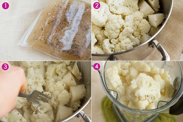 1. Add cauliflower, garlic and broth to pot. Cover and bring to boil. Reduce heat to simmer and cook for 20 minutes.