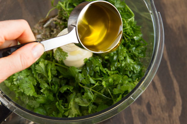 First, you want to make the herb mixture really smooth. This is the component of the recipe that holds everything together!