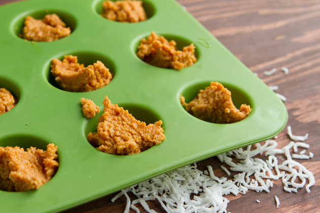 Press the pumpkin mixture into the bottom of the silicon molds, follow with coconut mix.