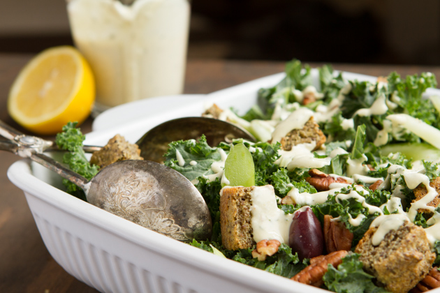 A low-carb, keto, grain-free and paleo kale salad with dairy-free rosemary lemon salad dressing grain-free chia croutons.
