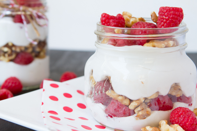 3-Ingredient high-fat, keto vanilla creme pudding sweetened with stevia, layered with fresh berries and raw walnuts.