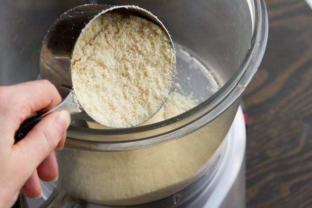 The grain-free pie crust made with keto-friendly almond flour is super easy. Add to your food processor and process until the dough forms a ball. It will happen relatively quickly, so watch out!
