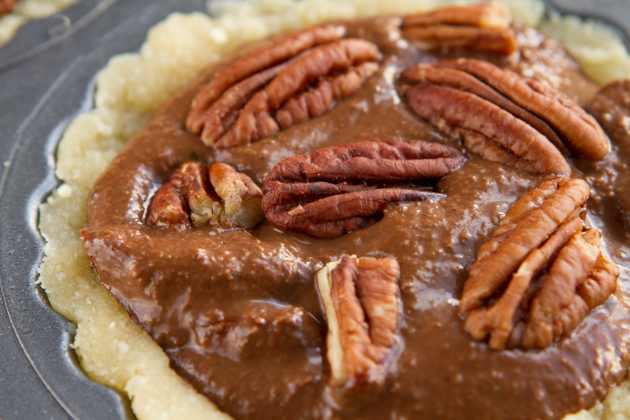 Stir in those pecans then transfer to your pie pan or tart pan and top with additional pecans. At this point? You’ll be AMAZED that this keto pie has no sugar… and is made creamy with zucchini. Just look at how perfect that is. Ah!