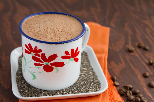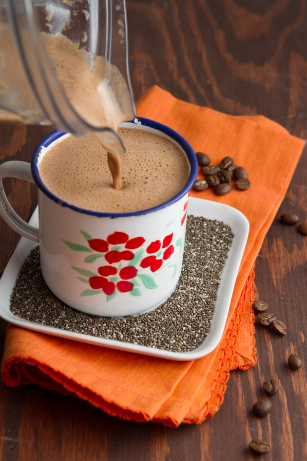 Chia seeds! In coffee, crazy, right? They are pulverized and add to the frothy goodness of this dairy-free blended coffee recipe. Keto-approved fiber, omegas, oh my!