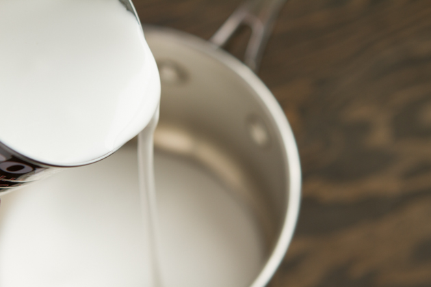 Divide the coconut milk and place ½ cup in the saucepan, the rest in the blender.
