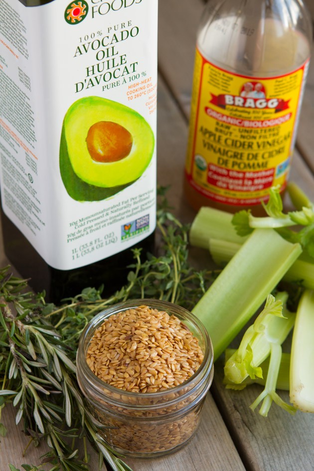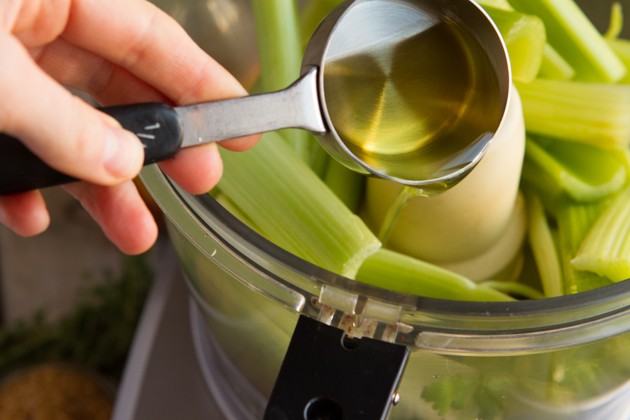 2. Place celery, oil, vinegar, herbs and salt in the bowl of your food processor. Pulse until celery is completely pureed.