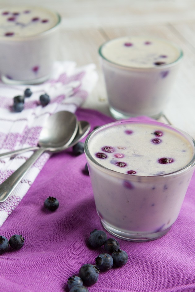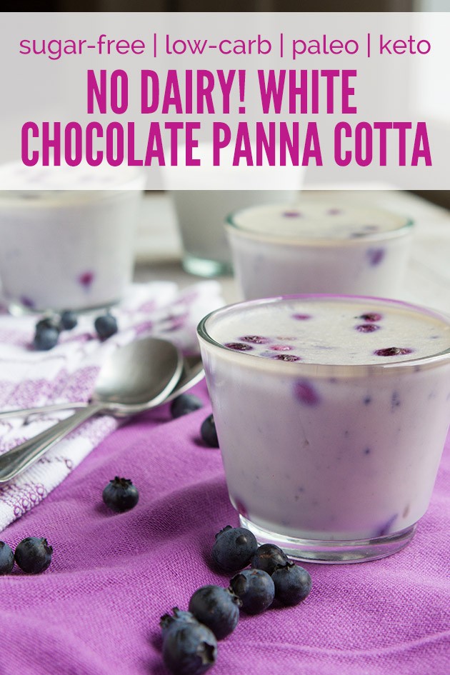 Cups of dairy-free, keto panna cotta, flavored with notes of keto white chocolate and sweetened with fresh blueberries. Boosted with collagen and gelatin!