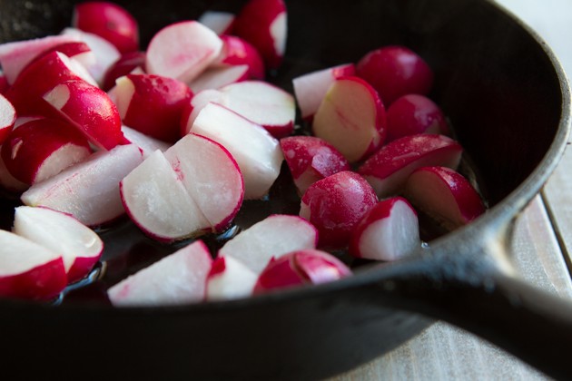 You could also make these on your barbecue, in one of those barbecue vegetable baskets. I’ve done it a bunch of times, but like the cast iron version better because the fats stay in the pan, letting the radishes soak it up!