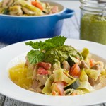 Dairy-free, keto coconut curry made with keto full-fat coconut milk, chicken thighs and fresh vegetables. Adorned with a dollop of keto cilantro mint herb pate – sauteed spinach, cilantro, mint and lime juice.