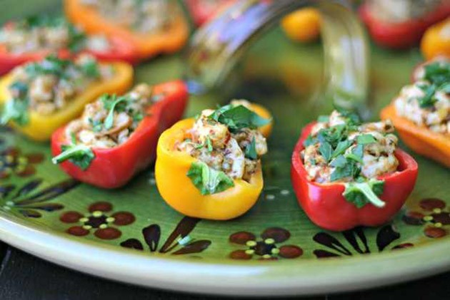 I combined the crunch and sweetness of sweet, baby bell peppers with some wild-caught Oregon Pink Shrimp (which by the way, usually come already cooked) lightly tossed with my Lightened Up Basil Pesto, a drizzle of olive oil, a squeeze of lemon and a bit of crushed red pepper flakes.