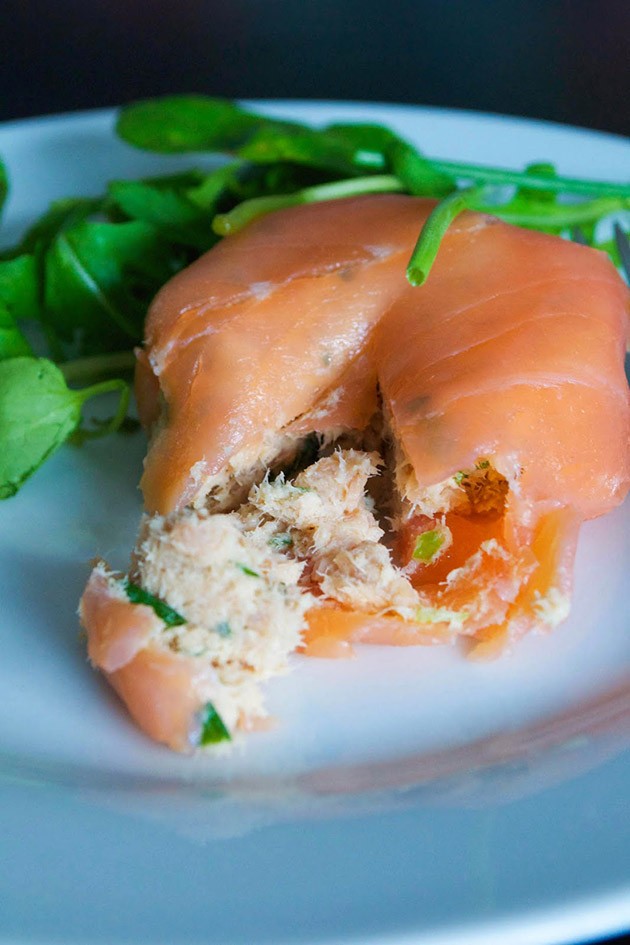 Keto chopped salmon tossed with chives and enveloped by smoked salmon.