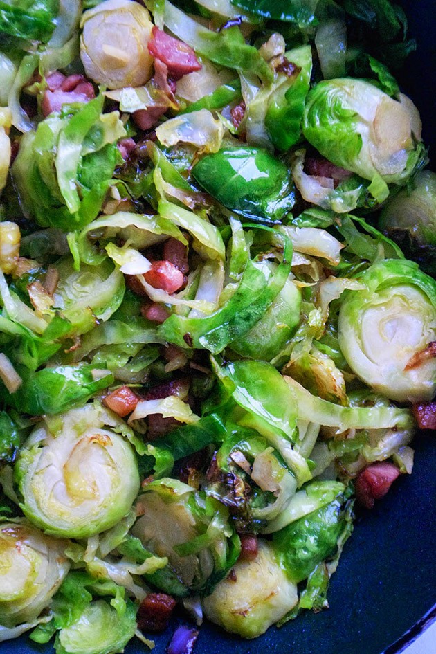 Crispy keto bacon tossed with Brussels sprouts and ginger.
