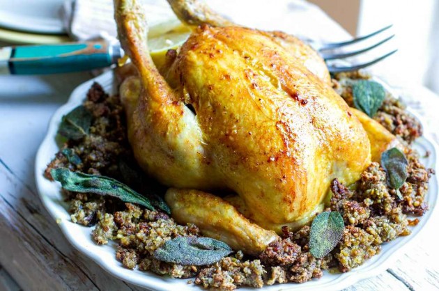 The stuffing is made with so many delicious things – sage, bacon, leek, garlic, nuts.