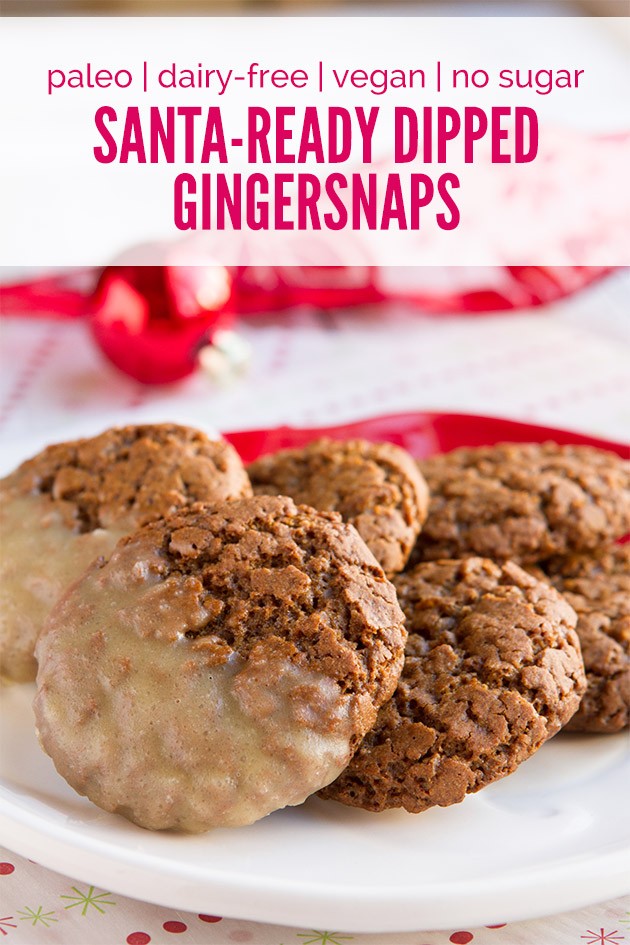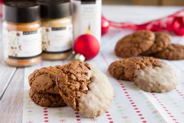 Melt-in-your-mouth ginger cookie recipe with a chewy texture. Dipped in homemade vegan white chocolate for a Santa-ready cookie. No milk dipping required! Made with Epicure spices and baking tools.