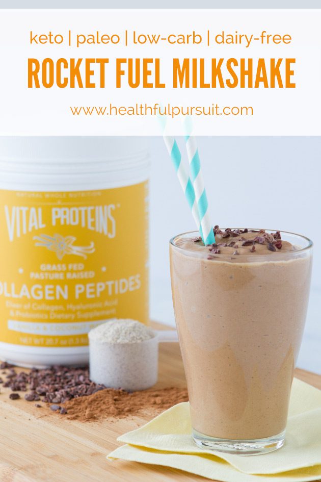 A thick, creamy, dairy-free keto milkshake, perfect for breakfast. Thickened with avocado and mega boosted with probiotics and collagen from Vital Proteins vanilla & coconut water grass-fed collagen peptides.