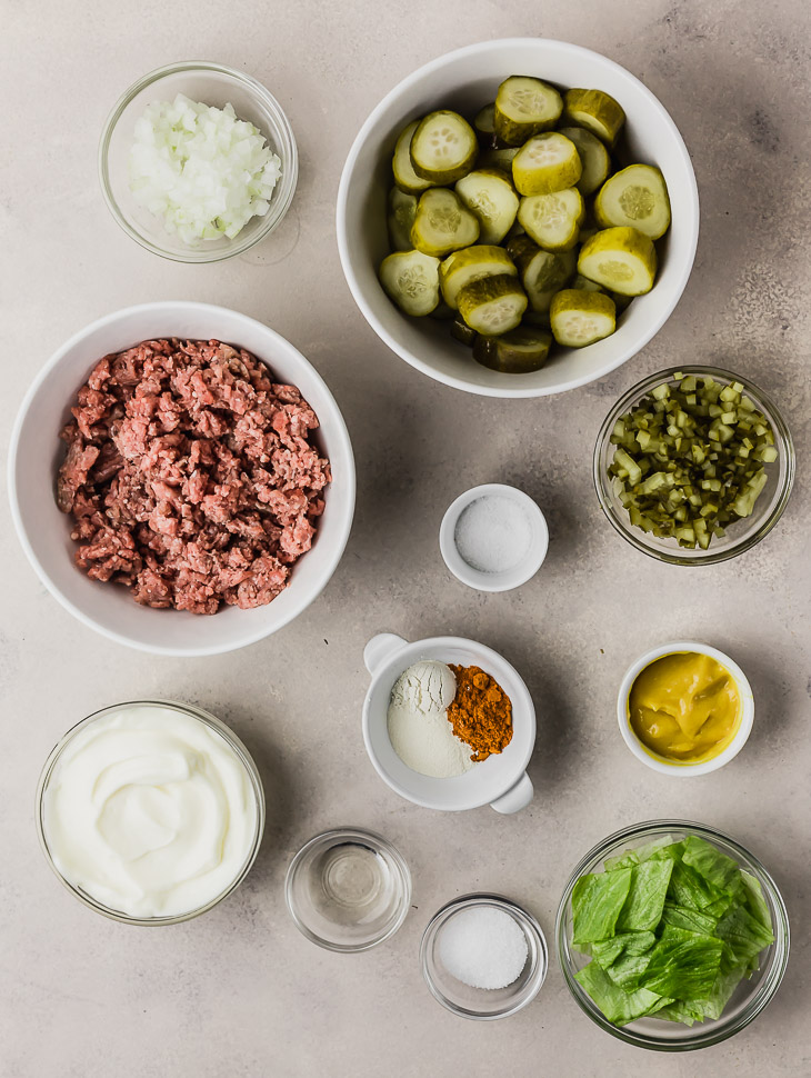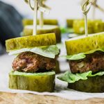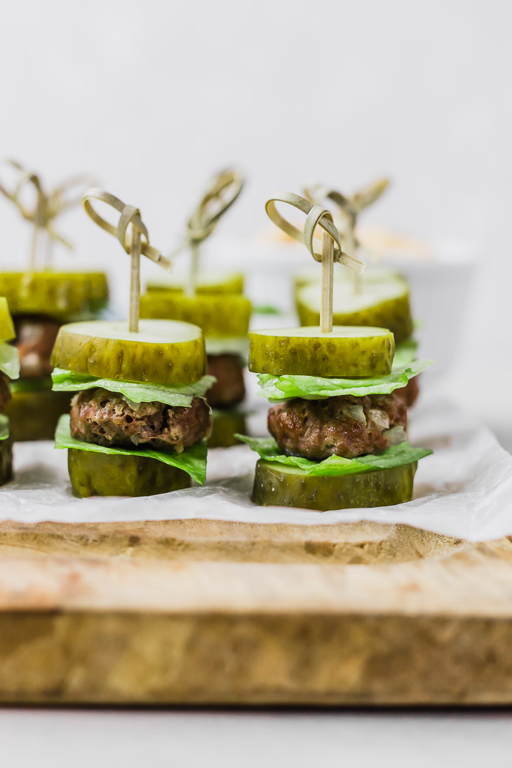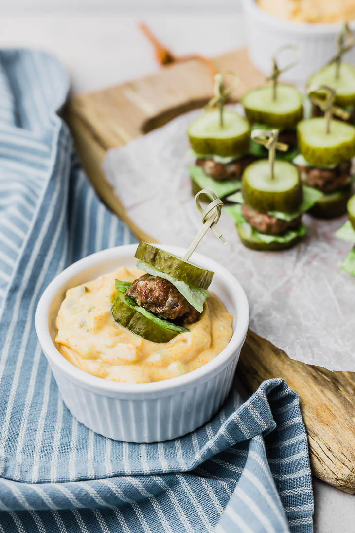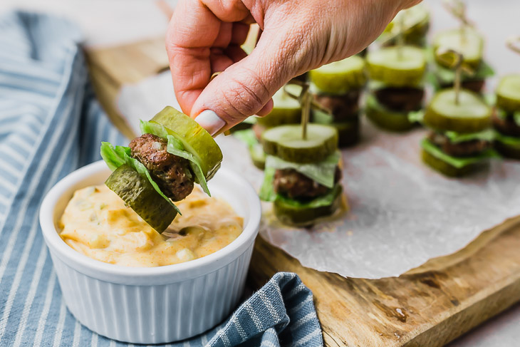 Who knew, pickles as buns! Such a great idea, right? And, an even better idea is to serve it alongside a dipping sauce of your choice. I’ve included a dipping sauce recipe that works really great with the little burger bites, but any dressing will do the trick!