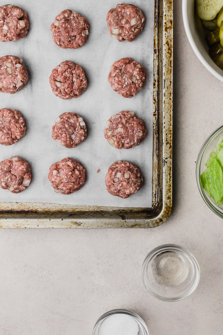 3. Place the beef, finely chopped onions, and salt in a large bowl. Mix with your hands until thoroughly combined. Then, roll into small balls about the size of a golf ball. You should be able to make 12 balls in total. Place the completed balls on the prepared baking sheet and press down with your palm slightly so they’re more cookie shaped.