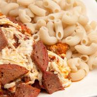 - Place chicken at the bottom of 2.3L casserole dish, pour marinara sauce over top, then cheese, and finish it off with pepperoni.