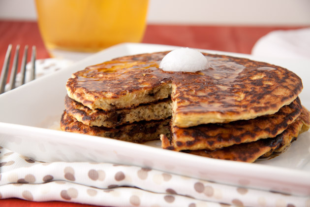 Recipe by Healthful Pursuit at https://www.healthfulpursuit.com/2011/10/banana-chocolate-chip-protein-pancakes/