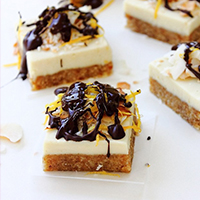 Remove set lemon square from the tin. Slice into 8 - 10 squares. Sprinkle toasted coconut and lemon zest on top of each one before drizzling each with the melted dark chocolate.
