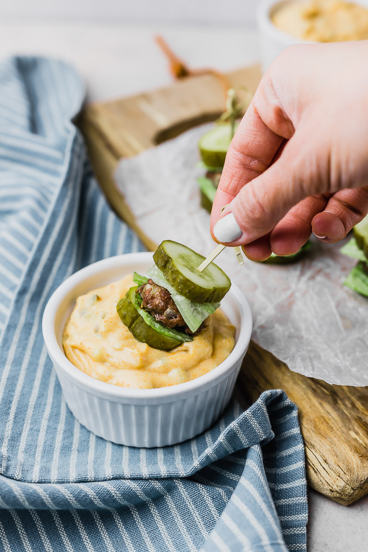 When the patties are complete and have cooled slightly, place on top of a dill pickle slice, followed by a piece of lettuce, and a second dill pickle slice. Press a toothpick through the slider and set on a serving plate.