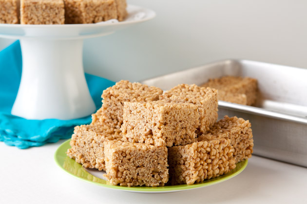 Healthier version of classic rice crispy treats without the gelatin! Each square is just 5 grams of fat and less than 150 calories.
