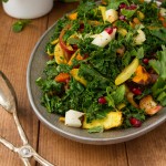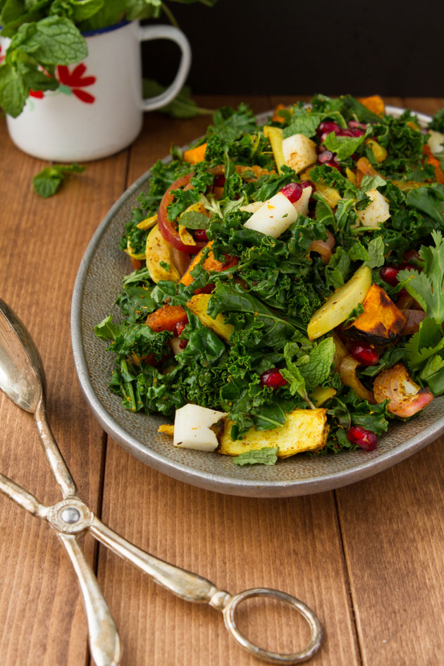 Gluten-free, paleo and vegan salad with curry-infused roasted vegetables in a tart lemon sauce, folded in with fresh coconut meat, kale and pomegranate seeds.