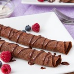 Delectably thin paleo chocolate crepes made with natural ingredients. Drizzled with dark chocolate sauce and a dollop of dairy-free strawberry marscapone.