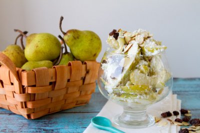 Cool off with this creamy fruit salad made with fresh pears, slivered almonds and goat cheese feta crumbles.