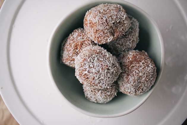 Healthy chocolate bites sweetened with dates and covered in shredded coconut.