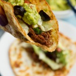 3-Ingredient corn-free, low-carb soft tortillas stuffed with taco meat, zucchini salsa and MCT guacamole.