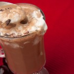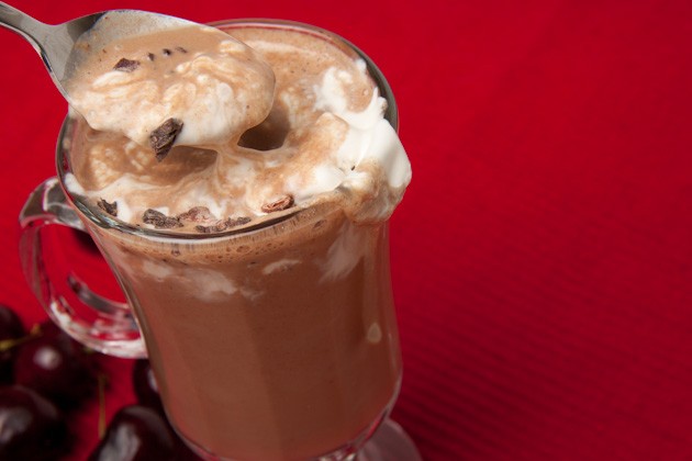 Homemade sugar-reduced hot chocolate topped with coconut milk ice cream