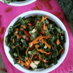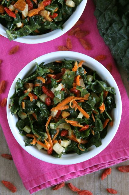 Healthy kale salad made with goji berries, roasted almonds in a maple dressing.