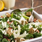 A low-carb, grain-free and paleo kale salad with dairy-free rosemary lemon salad dressing grain-free chia croutons.